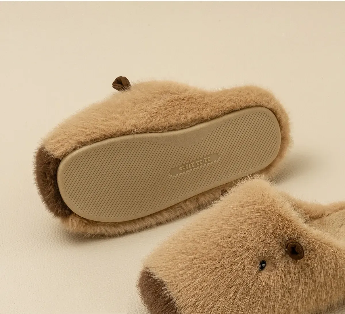 The slippers are designed with imitation mink fur in a capybara cartoon shape, which is both warm and cute. Combined with high-density imitation marshmallow fleece, they are carefully processed by experienced cold-gluing craftsmen through 20 steps, including compounding, bonding, gluing, and pressing, and 12 manual inspections to ensure the quality of the finished slippers.